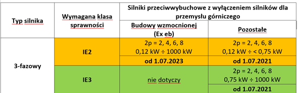 Do roku 2021 wymagania odnośnie do minimalnego poziomu sprawności silników wprowadzanych na rynek UE nie obejmowały swoim zakresem silników przeciwwybuchowych, dla których jedynym obligatoryjnym aspektem konstrukcji było zapewnienie odpowiedniego poziomu bezpieczeństwa użytkownikom w strefie zagrożonej wybuchem. Rozporządzenie Komisji Europejskiej 2019/1781 & 2021/341 wprowadziło rewolucyjne zmiany w powyższym zakresie. Od 1 lipca 2021 r. wszystkie silniki przeciwwybuchowe, z wyjątkiem silników górniczych przeznaczonych do eksploatacji w podziemiach kopalń oraz silników budowy wzmocnionej, muszą spełniać wymagania dla klasy sprawności IE3. Natomiast od 1 lipca 2023 r. obligatoryjnym minimalnym poziomem sprawności dla silników przeciwwybuchowych budowy wzmocnionej (Ex eb) stał się poziom określony dla klasy sprawności IE2. Po tej dacie niemożliwe jest wprowadzanie na rynek silników o niższej sprawności.
