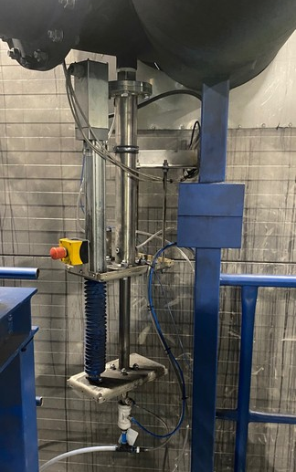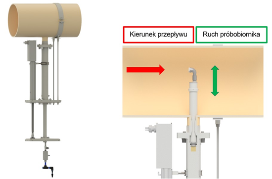 Próbki materiału mogą być pobierane w układach spadku swobodnego, np. pod podajnikami lub zaworami celkowymi, jak również w przewodach transportu pneumatycznego, np. za klasyfikatorami aerodynamicznymi. FOT.3 przedstawia próbobiornik stosowany w przypadku pobierania próbek w transporcie pneumatycznym. Jest to system peryskopowy, który pozwala na całkowite chowanie się elementu pobierającego w pozycji spoczynkowej, gdzie nie ma przypływu materiału, a w konsekwencji nie następuje niepotrzebne zużywanie części pomiarowej. W momencie samego pomiaru silnik krokowy precyzyjnie przesuwa element pobierający wzdłuż średnicy rurociągu. Przesuw ten jest również indywidualnie zaprogramowany co do prędkości przesuwu, strefy pomiarowej i ilości cykli, w zależności od ewentualnej niejednorodności przepływu i niestabilności profilu prędkości, tak aby pobrany materiał był najbardziej reprezentatywny. W ten sposób można eksperymentalnie dobrać sposób pobierania próbek w zależności od położenia próbobiornika na rurociągu oraz lokalnych warunków przepływu.