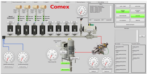 Do kontroli procesu wykorzystuje się system CMA (Comex Multichannel Analyser) jako nowoczesne wielokanałowe urządzenie pomiarowe składu ziarnowego metodą online. FOT. 1 przedstawia wspomniane urządzenie, które firma Comex dostarcza na rynek światowy od wielu lat. Sam system pomiarowy wykonany jest w oparciu o dyfraktometr firmy Malvern Instruments, gdzie wykorzystany jest efekt dyfrakcji laserowej. FOT. 2 prezentuje zaawansowany panel sterowania, gdzie zebrane są podstawowe informacje na temat pobieranej próbki w danym kanale. System CMA umożliwia zebranie danych o procesie nie tylko w jednym miejscu, ale również w innych strefach produkcyjnych, gdzie ważne jest rozpoznanie niepożądanych odchyleń charakterystyki materiału. W standardowym rozwiązaniu systemu pomiarowego stosowanych jest osiem kanałów do automatycznego pobierania próbek z procesu produkcyjnego oraz jeden kanał do ręcznej analizy dowolnego materiału. Każdy cykl pomiarowy może być niezależnie zdefiniowany co do długości pomiaru, sposobu uśredniania danych, prezentacji pomiarów, archiwizowania wyników itd.